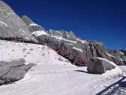 There are nineteen glaciers under the Thirteen Peaks of Jade Dragon, which look like a waterfall hanging under the steep Fanzi slope, shining silver under the sunlight. The most famous among them is the Black and White Glacier, along with the vast meadow of Gan Haizi and the unique spring snow scenery.