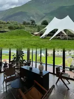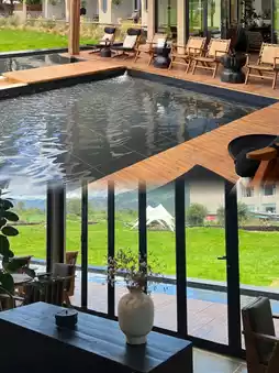The common areas include an infinity pool 🏊, a viewing platform 🌄, a Zen-inspired library 📖, and a terrace cafe 🍴. The infinity pool offers stunning views of the snow mountain, perfect for photos. In addition, the hotel has a large lawn area suitable for bonfires 🔥 and barbecues 🍖.