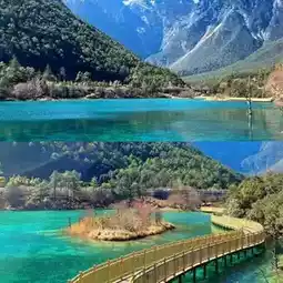 After visiting Spruce Meadow, take the cable car down and then the shuttle bus to the second stop "Shueyue Pavilion" - this is Blue Moon Valley. If you want to visit this spot, check the weather forecast first, as the scenery varies greatly depending on weather conditions. Only on sunny days can you truly appreciate the beauty of the blue-green lake waters under sunlight. The water is crystal clear, like a huge mirror reflecting the surrounding snow mountains and blue sky - it's breathtaking.