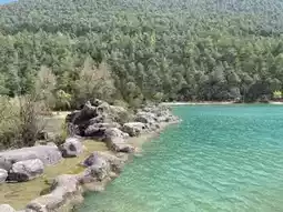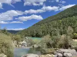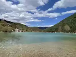 Blue Moon Valley at the Jade Dragon Snow Mountain National Park offers a breathtaking view where the turquoise-green lake contrasts beautifully with the sky. When sunlight hits the water's surface, it sparkles, creating a romantic setting perfect for couples to capture memorable photos.