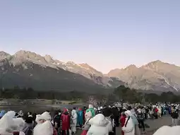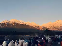 ▸ The crowd is tempered into obsidian in the -7°C cold wind! Frost forms on thick down jackets and knitted hats, while a forest of phone stands pierces the indigo sky. The snow-capped mountain's silhouette emerges in the icy tempering process.