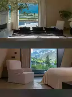 ✨ Wake up to the sight of the golden sun on the mountain! Every room is equipped with extra-large floor-to-ceiling windows and a scenic bathtub, so you can enjoy the snow mountain view while cozy inside the room