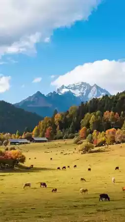 A Naxi ethnic original ancient village, Dragon Maiden Lake reflecting the snow mountain, cattle and horses grazing by the lake, time seems to stand still.