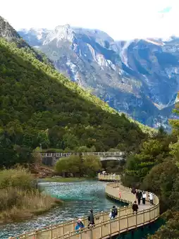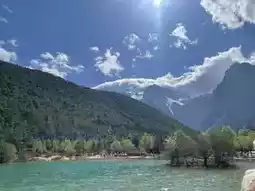 The crystal-clear turquoise water winds around the foot of Jade Dragon Snow Mountain, reflecting the white clouds and the highland sunlight – breathtakingly beautiful.