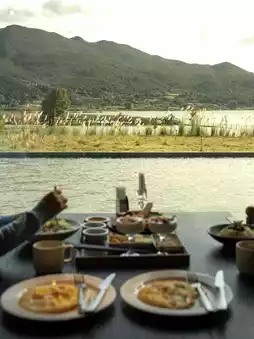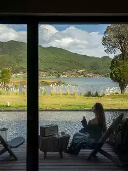 Combining traditional Naxi architecture with modern wild luxury style to a new height! The whole house has floor heating + smart toilets to save you from the cold plateau climate. The best part is every room has a stargazing bathtub and 270° floor-to-ceiling windows. We stayed in a water-view room; opening the window in the morning revealed a mist-covered lake, like living inside a landscape painting—unreal.