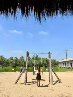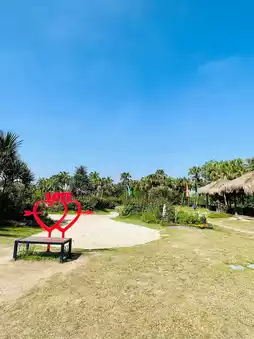 Palm trees dot the park, and thatched cottages are nestled amidst lush greenery.