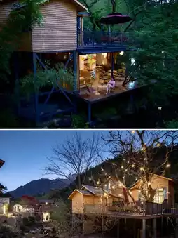 48 guest rooms are scattered throughout the valley, presented in two phases: Phase one includes pink lofts for besties, wild luxury cave houses, and Japanese Zen suites, each like an independent art gallery; Phase two features wooden houses: creekside treehouses and 360° panoramic glass rooms, using natural wood and rammed earth to restore natural textures; wild tent rooms: newly added starry sky tents this year, where you can lie down and watch the Milky Way fall into the mountain stream.