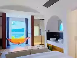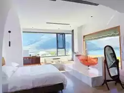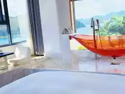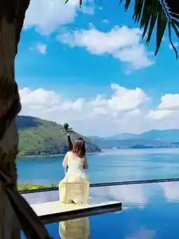 The entire Fuxian Lake spreads out beyond the floor-to-ceiling window, water and sky blending into one, shimmering like a breathing painting.