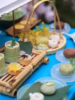 Hand Washing Ceremony: Wash hands with clean water, copper basin floats with green onions, apples, and rice