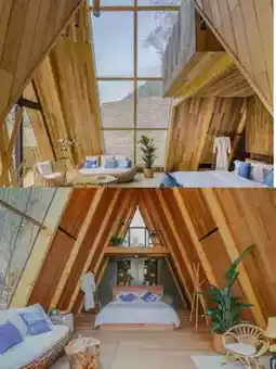 Among them, 11 are the homestay's signature triangular wooden houses🏕️. These triangular houses have high ceilings, excellent natural lighting☀️, and a bright, open view👀. The round bird's nest🪹 treehouse looks like a big straw hat👒, with a double-layer LOFT structure and two large beds🛏️, accommodating 4-6 people. At night, you can climb onto the roof to watch the stars✨ and the moon🌙—an absolutely perfect spot for photos📸~