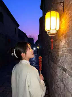 We chose a "corner spot" in the middle of the old street for our photos: my bestie stood on the stone path with her back to the lanterns, while I held the phone (flash on) about 1 meter away and took a slightly upward shot. The flash perfectly illuminated her face, making her skin glow without looking oily. The background featured warm yellow lanterns and a blue-purple sky, creating a stunning contrast. Even the pearl hair clip in her hair sparkled softly.