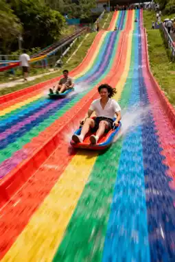 Enjoy activities without breaking the bank 🎢! The popular glass walkway is suspended over the valley, offering views of the forest below. It's not scary but makes for stunning photos — and it's free! Don’t feel like walking down? Try the rainbow slide for an exhilarating ride to the base in just seconds, and it only costs 20 yuan. Kids will love it so much they'll want to go again. At the foot of the mountain, there's a free children's play area with swings and seesaws, where parents can relax and soak up the sun.