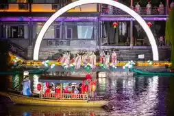 When dusk washes over the ancient city's bluestone slabs, Tai'erzhuang truly awakens. Red lanterns light up one by one along the river, casting a warm glow on the water, making it the perfect time to take a sculling boat. The boatwoman's song, accompanied by the gentle splash of oars, glides past carved wooden windows and upturned eaves, as if time itself has slowed down, filling the boat with gentle, ancient romance ✨.