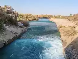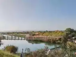 From an elevated vantage point, the autumn scenery of Golden Lake Populus unfolds in its full glory. The turquoise waters of the Yarkand River—now rushing, now gentle—glitter under the sunlight. The riverbanks are embraced by golden and brown poplar trees and shrubs, creating a rich tapestry of colors. In the distance, forests stretch layer upon layer, bathed in golden autumn hues—a vast and breathtaking view. Closer by, well-placed buildings and wooden walkways blend harmoniously with the untamed beauty of nature, composing a majestic and unique borderland panorama.