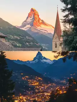 The Matterhorn—the most legendary pyramid of the Alps, standing majestically above Zermatt. When the first morning light kisses its summit, the mountain transforms into a dazzling "Golden Triangle," mirrored perfectly on the glassy surface of Stellisee Lake. In this moment, time itself seems to stand still. Free from the noise of cars, only the chime of cowbells and the hum of cogwheel trains fill the air, transporting you into the fairy-tale world of *Heidi*.