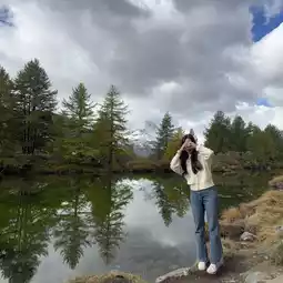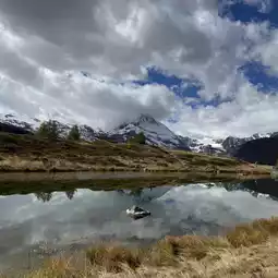 A small lake hidden amidst dense forest 🌲. It's a great spot to capture the Matterhorn with wildflowers blooming by the lake. Although the reflection angle is lower, the silhouette of the mountain peeking through the trees is incredibly romantic 🌸