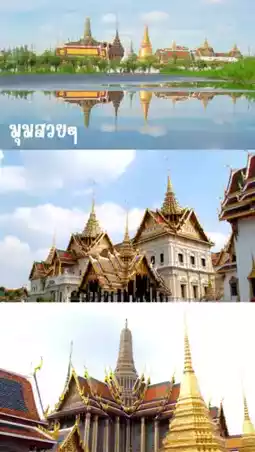 Top image: Shows the Ubosot (ordination hall) and various buildings within Wat Phra Kaew, a magnificent Thai architectural structure. The golden color reflects the sunlight.