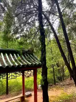 The deeper you walk, the wilder and more charming the scenery becomes. Small islands float in the middle of the water, covered with lush trees whose names I can’t call out, but their shadows are cast thickly on the turquoise water, mingling with the reflections of clouds and sky. In the distance, there are mountains—not very high but continuous, like a blue-green screen neatly placed on the horizon. At this time of year, the willows on the shore are still green, but the poplar leaves have turned yellow. Here and there, a few maple trees show early crimson layers, reflected in the water, turning the surface into a living, flowing painting. I stood alone on the bridge, looking around with no one else in sight, hearing only my own breath and the birdsong near and far. Suddenly, I recalled Liu Zongyuan’s words about Xiaoshi Pond: “Silent and deserted, chilling to the soul and bones, quiet and deep,” the mood somewhat similar, but here there was no chill, only a vast tranquility that emptied my body and mind.