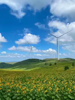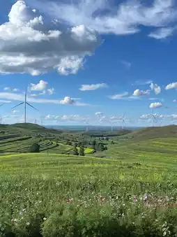 Along the Sky Road, thousands of white wind turbines are distributed, interwoven with grasslands, terraces, and birch forests, forming iconic scenery that looks like a sci-fi painting especially under the blue sky and white clouds.