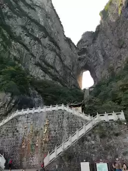 Standing at the edge, you’re treated to panoramic views of lush forests and dramatic cliffs below, with the cave's narrow opening framing the sky. To reach this iconic spot, take the thrilling Tianmen Mountain cable car, one of the longest in the world, which offers jaw-dropping views of the winding roads below.