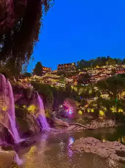Next to the thousand-year-old Tujia ancient town, a waterfall cascades down. At night, pumpkin lanterns illuminate the ancient streets, creating a scene of tranquility and harmony together with the waterfall.