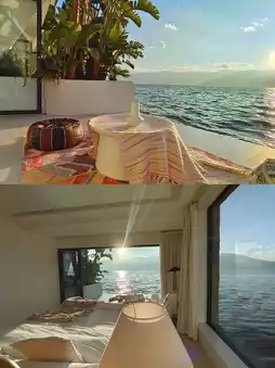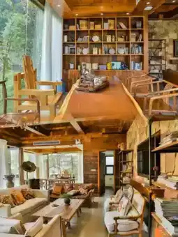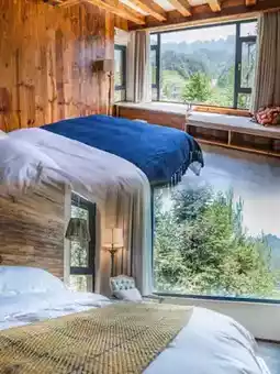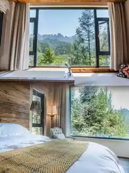 This architecturally stunning white villa harmonizes beautifully with the surrounding emerald mountains! Rooms feature warm wood elements + soft lighting, with freestanding bathtubs against floor-to-ceiling windows offering panoramic mountain views🛁! At night, sway on the terrace rocking chair counting stars to the sound of cicadas - pure magic!