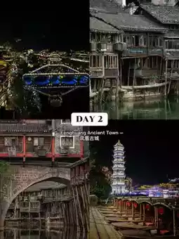 I journeyed to the picturesque Fenghuang Ancient Town. 🌄 Stilted houses along the Tuojiang River 🏞️ captivated me with their beauty and cultural richness. I stayed within the town, soaking in its evening ambiance. ✨