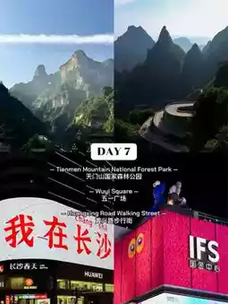 I spent the day at Tianmen Mountain National Forest Park, experiencing Tianmen Cave and Glass Skywalk. ⛰️✨ Returned to Changsha via high-speed train, exploring Wuyi Square and Huangxing Road Walking Street. 🎉