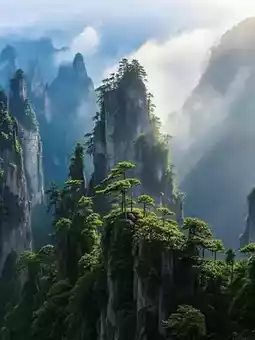 2. Verdant Vegetation: The peaks and surrounding valleys are lush with greenery. Trees tenaciously grow in the cracks of the cliffs, adding vitality and dynamism to the scenery.