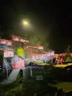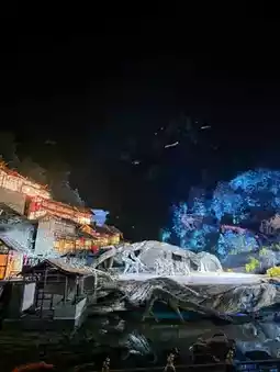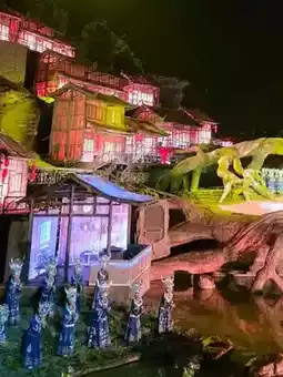 * **Grand-scale decorations:** A village of over 10 authentic Tujia ethnic huts has been built on the mountain slopes. These structures change color thanks to special lighting, creating a magical atmosphere.