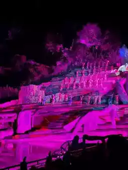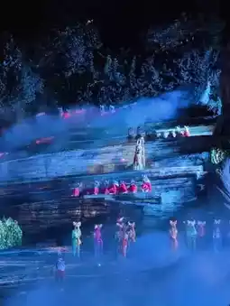The main highlight of the show is its location in a **natural canyon stretching 5 km** at an altitude of over 1,000 meters. The stage is seamlessly integrated into the landscape, where **real mountains, forests, and waterfalls** serve as natural backdrops.