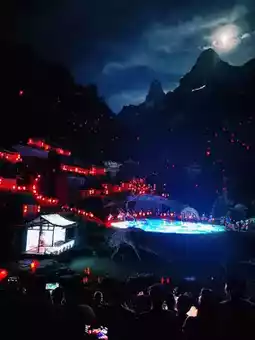 When the show began, the entire valley seemed to come alive. The story of the fox fairy and the young man unfolded through dance, music, and colorful lights, mixing folklore with a touch of magic. At times, the performers seemed to float against the mountain backdrop, their voices rising into the night air. I found myself smiling, touched by the romance and the dreamlike atmosphere.
