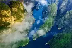 Stunning natural scenery: green mountains and clear waters, mist swirling like a fairyland🌄.
