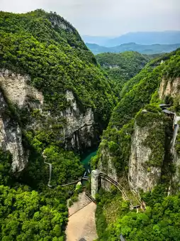 The main attraction is the natural arch "Heaven's Gate," formed by the collapse of a section of rock. The "Road to Heaven" – a serpentine road with 99 hairpin turns – leads to the foot of the mountain, and you can ascend the mountain on the world's longest cable car (approximately 7.5 km long).