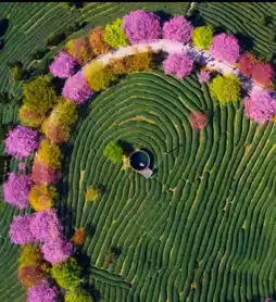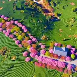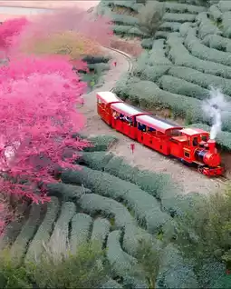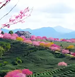 2. Stroll through the tea gardens, where cherry blossoms adorn the branches. The tender green tea trees embrace the crimson sea of flowers. Every step is filled with romance and freshness, making the most of the beautiful spring days.