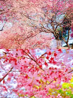 ❷ Mid to late February: Pink and vermilion cherry blossoms bloom together, with rich colors and the largest scale