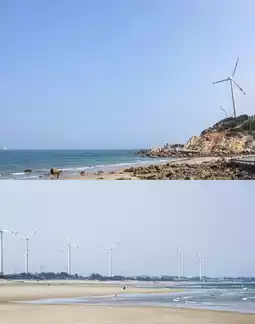 Windmill Fields: Nearby wind farms feature white wind turbines set against the blue sea and sky, making it a popular destination for photography enthusiasts.