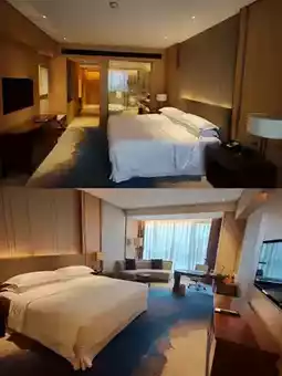 With over 400 rooms, elegant design, Sheraton standard LCD TV 📺, office desk, sweet dream bed 🛏️ and bathtub 🛁 Some rooms have outdoor balcony open-air bathtub 🛁. Friends who want to see the sea view can choose the deluxe sea view room (recently in the peak season of Zhanjiang tourism, oyster 🦪 peak season, the room is more tight, need to book in advance) 🏙 I chose the deluxe queen bed 🛏️ room is city view 🌃, because it is the city center, the view is quite beautiful [Askance].