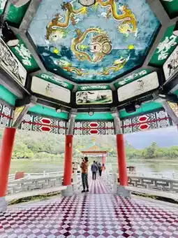 At the center of the pavilion, five intricately carved dragons seem ready to soar into the sky at any moment. The couplets on both sides express wishes for favorable weather and national prosperity. Standing inside the pavilion, you can feel the gentle breeze from all directions and enjoy the endless lake view, bringing a sense of relaxation and joy.
