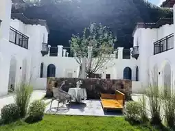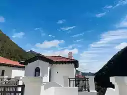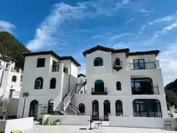 They are authentic Italian Tuscan-style buildings, with off-white walls shining pure and bright under the post-rain sunlight. The rough texture exudes rustic warmth, and the red sloped roofs complement the exquisite arched doors. These buildings seem not built here but drifting from the Tuscan sunshine, resting by chance among these mountains and waters.