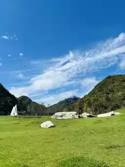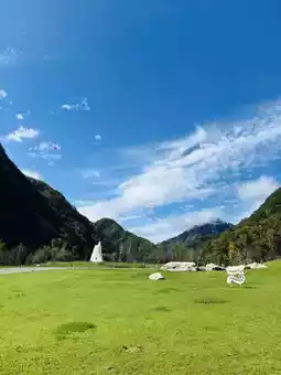 After the rain’s cleansing, every blade of grass is full of green vitality, unfolding in the morning light. The sunlight falls just right, instantly turning the entire lawn into a shimmering green ocean. Dewdrops linger on the grass tips, refracting scattered light like diamonds scattered on the ground. Walking through it, the grass gently brushes against the ankles, bringing a cool sensation. Raising the camera casually, no deliberate framing is needed—framed by verdant mountains and seated on boundless green grass, every angle is a painting. The sunlight here is especially gentle; with the interplay of light and shadow, every shot is stunning.