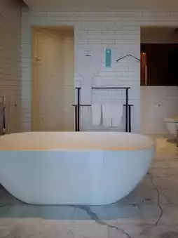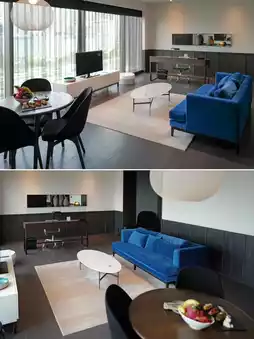 The rooms are equally design-forward, with artistic color schemes. The dark tones in the bedroom are particularly striking, forming a bold contrast with the white hues of the bathroom.