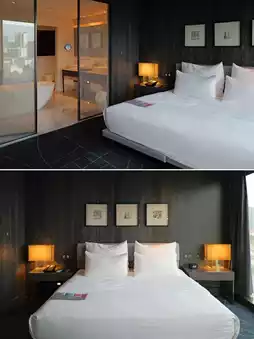 The hotel's exterior resembles a stack of staggered boxes. Inside, the public areas feature a dark color palette adorned with art pieces and trendy collectibles sourced from around the world, creating an avant-garde and contemporary vibe that feels like stepping into a modern art gallery.