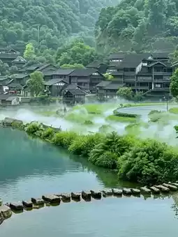 Enter from the east gate, the lake water at Xiaoqikong Bridge is jade green, kids happily play with stones and chase small fish by the creek