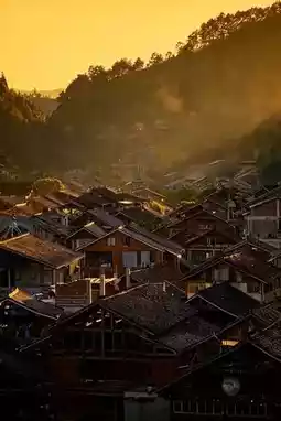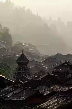 When the morning mist drifts over layers of green-tiled wooden buildings,