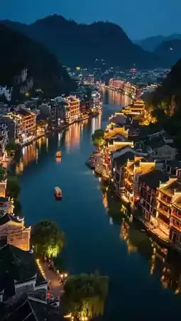 > "Nine mountains embrace a flowing river, night lights like stars falling on the border state."