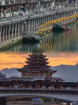 The world’s longest Dong Wind and Rain Bridge. In the evening, locals stroll, chat, and set up stalls by the bridge, creating a rich cultural atmosphere. It’s recommended to shoot panoramic views at the bridgehead and capture daily life inside the corridor.