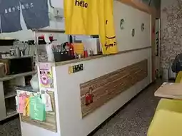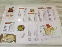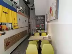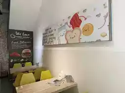 Today, a breakfast shop is open. Its narrow, long space, accented by bright yellow seating, creates a bright and vibrant dining atmosphere. The shop features a few wooden tables and chairs, and the walls are decorated with graffiti and cartoon-style illustrations, creating a relaxed and casual atmosphere. A self-service area for cutlery and sauces is located against the wall, allowing customers to easily help themselves. A yellow curtain with the words "hello" and "Smil" hangs at the door, adding a touch of intimacy. A "This Week's Rankings" menu section is also featured on the wall, showcasing the shop's signature dishes. The overall design balances functionality with ambiance, creating a relaxing breakfast experience.