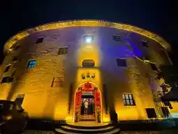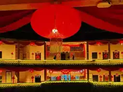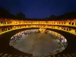 When night falls, the earthen building is decorated with lights, giving it a unique charm. The streets are crowded with people and the food stalls are filled with aromas. The bright lights and the starry sky complement each other, creating a warm and romantic picture.