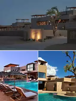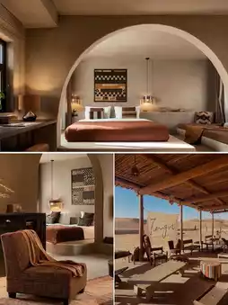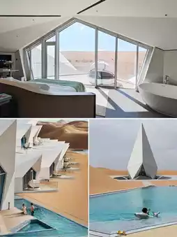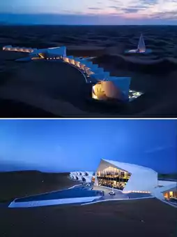 Like a diamond necklace decorating the vast desert. Rooms have panoramic floor-to-ceiling windows, so you can watch the desert sunrise and sunset from bed, and gaze at the brilliant starry sky at night.